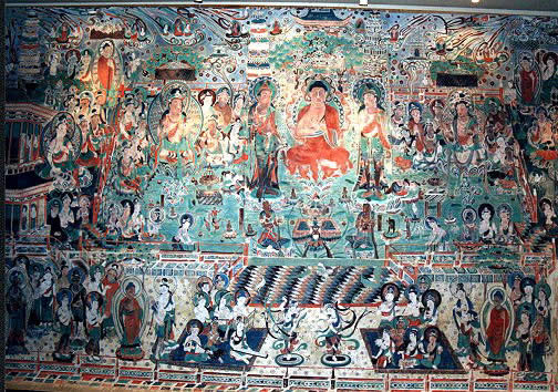 中國敦煌壁畫(唐代 復原圖)的 "阿彌陀經變"是初唐時期規模最大,保